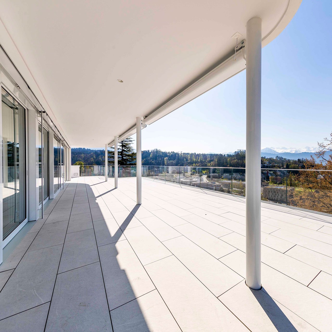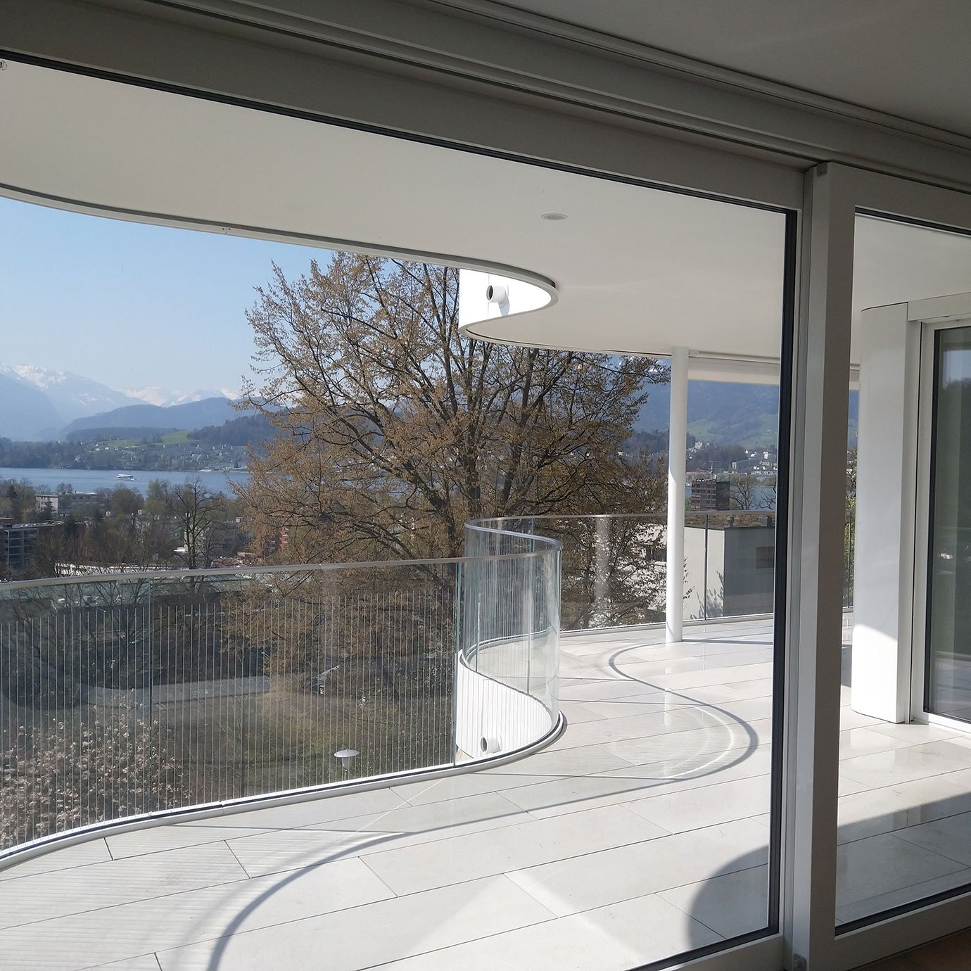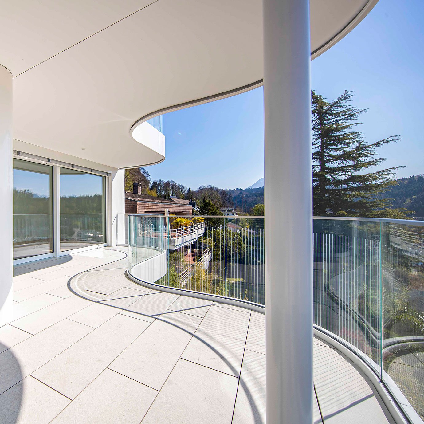 Im Wohnhaus "Diamond" an der Schlösslihalde in Luzern entstanden insgesamt vier individuell ausgebaute Eigentumswohnungen. Die hellen, lichtdurchfluteten Räume bilden einen fliessenden Übergang auf die geschwungene Terrasse und bieten einen beeindruckenden Ausblick auf See und Berge.