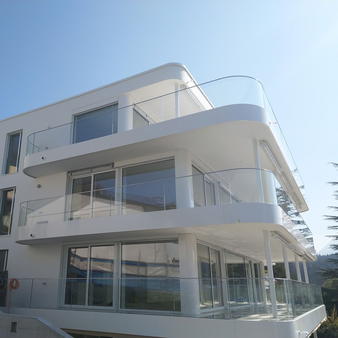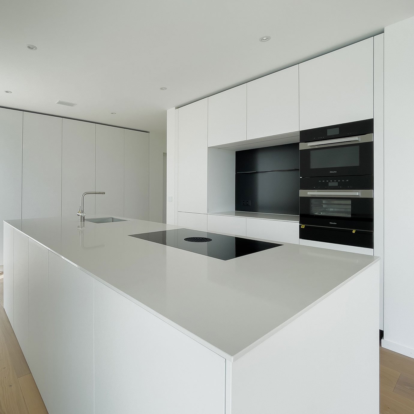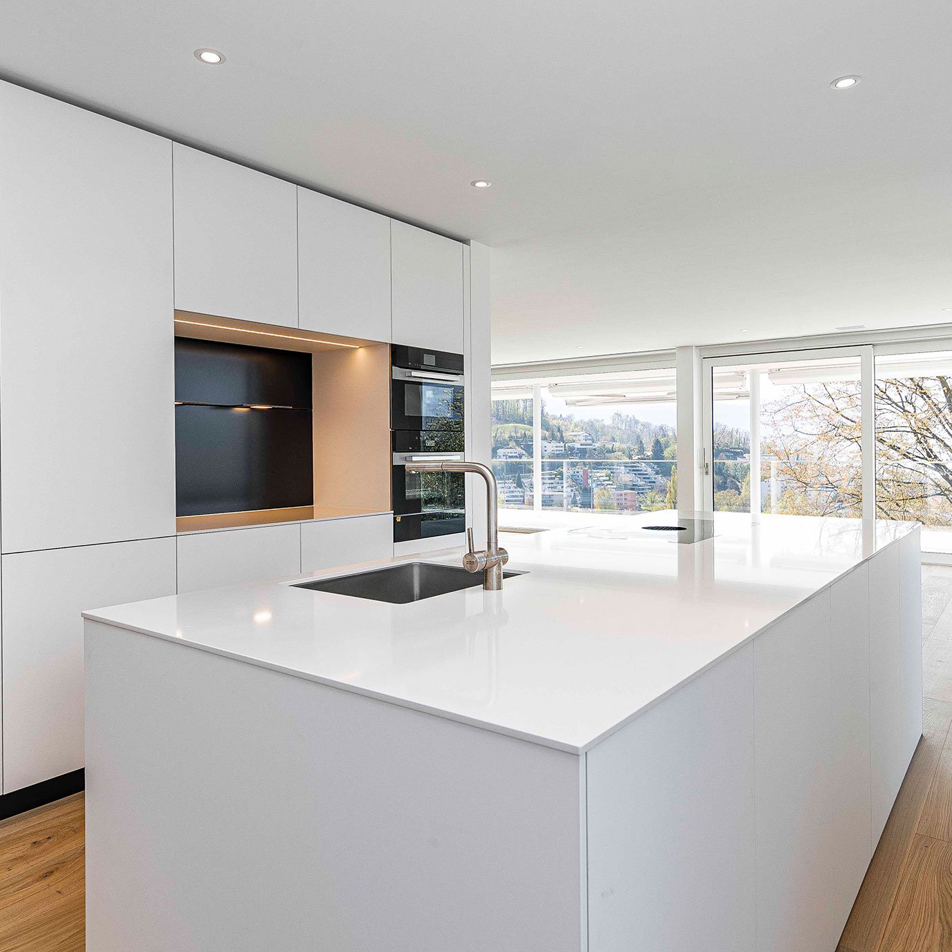 Im Wohnhaus "Diamond" an der Schlösslihalde in Luzern entstanden insgesamt vier individuell ausgebaute Eigentumswohnungen. Die hellen, lichtdurchfluteten Räume bilden einen fliessenden Übergang auf die geschwungene Terrasse und bieten einen beeindruckenden Ausblick auf See und Berge.